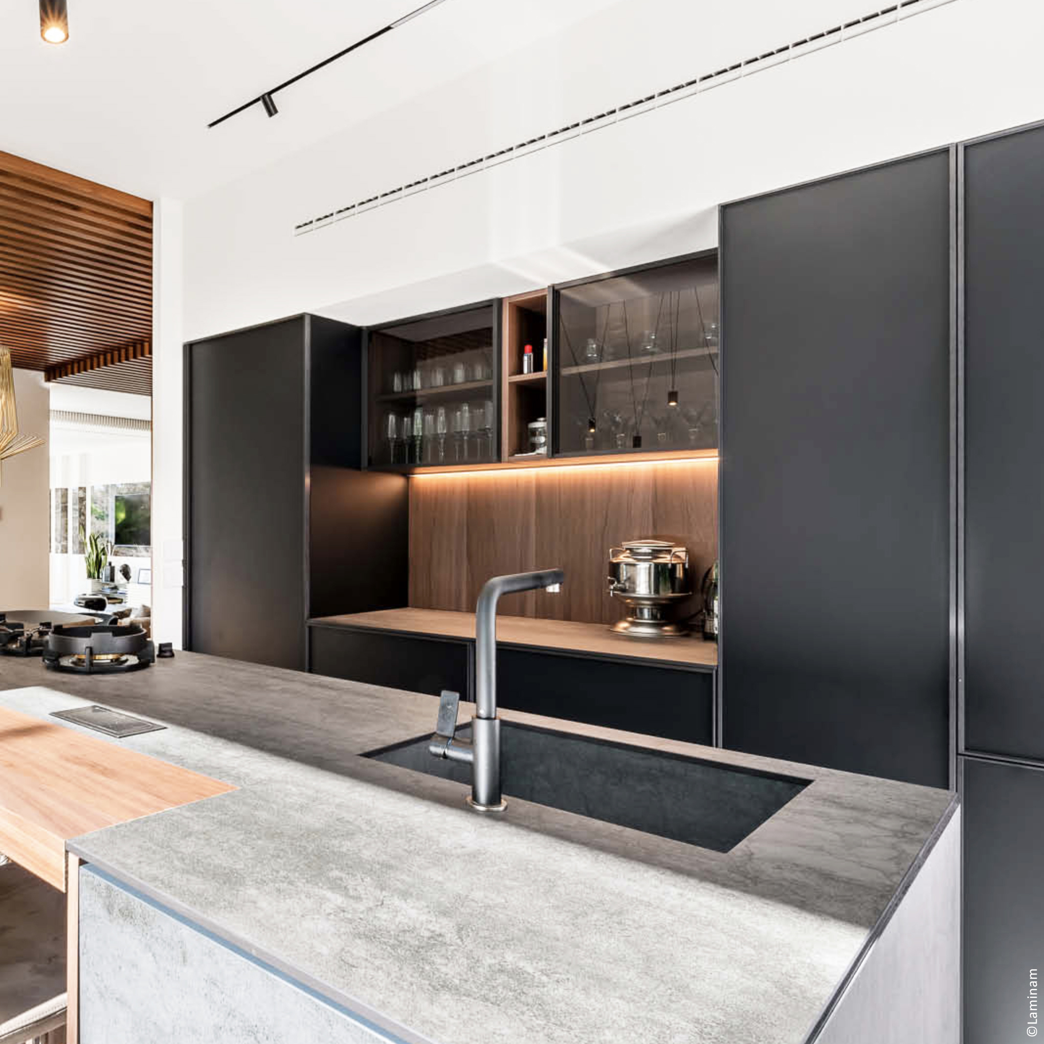Que votre cuisine soit spacieuse ou intimiste, nous façonnons sur mesure ses pièces maîtresses: plan de travail, crédence ou îlot central.